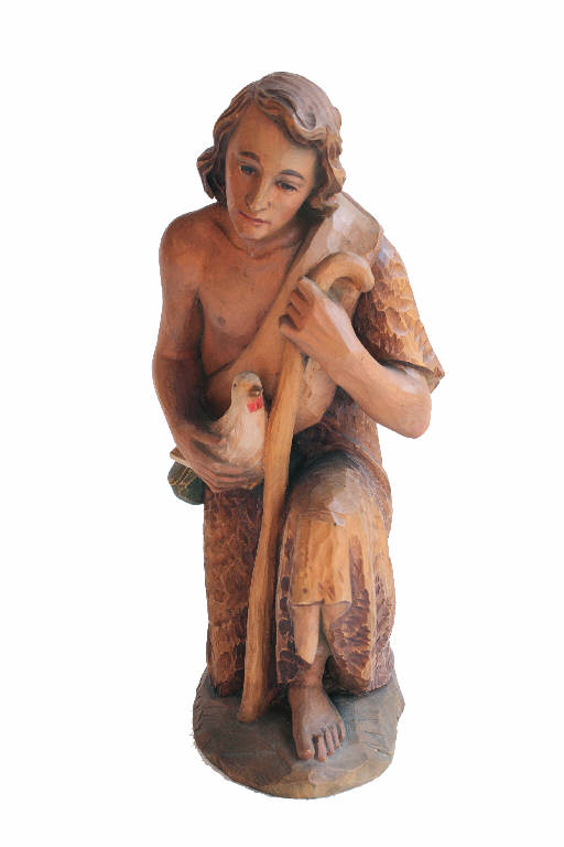 - NOTIZIE STORICO CRITICHE Figura rappresentante un pastore inginocchiato che sembra sostenersi con la mano sinistra ad un bastone. Nella mano destra porta un volatile probabilmente un colombo o un piccione.
