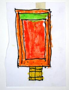 disegno a tecnica mista con pennarello nero e pastello a olio su carta bianca. Colore: nero, arancio chiaro, arancio scuro, verde, giallo, bianco. Soggetto: pianta di casa. Pezzo di scotch di carta nella parte superiore.