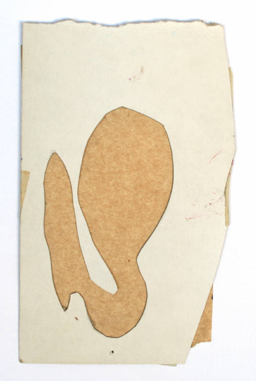 collage con cartoncino e carta da spolvero tenuto insieme da scotch di carta. Colore: beige e marrone chiaro. Soggetto: forma.