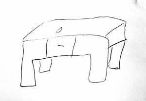 disegno a matita nera su carta bianca. Colore: bianco e nero. Soggetto: progetto di design, tavolo.