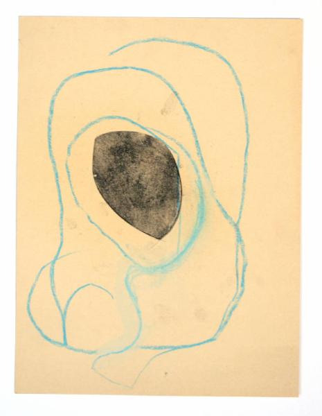 disegno a pastello a cera azzurro, su cartoncino beige, con l'inserto di una forma ritagliata e colorata a fusaggine; sul recto la forma è tenuta da scotch. Colore: beige, blu e nero. Soggetto: progetto per decorazione parietale.