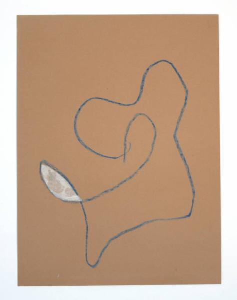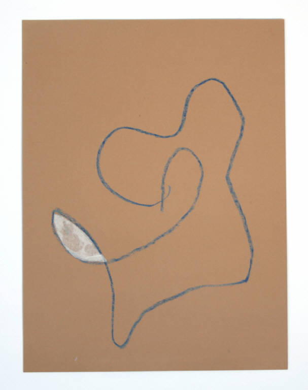 disegno a tecnica mista: pastello a cera blu su cartoncino marrone, con collage di carta velina bianca. Colore: blu, bianco e marrone. Soggetto: progetto per decorazione parietale.