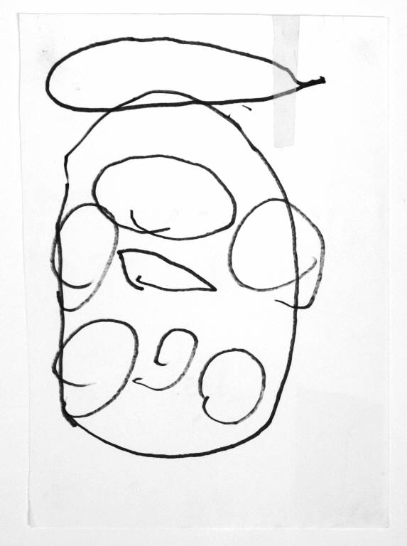 disegno a pennarello nero su carta con scotch di carta. Colore: bianco e nero. Soggetto: cerchi e forme.