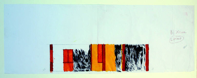 disegno a tecnica mista: pennarello e penna biro su fotocopia in carta bianca. Colore: bianco, nero, giallo e arancio. Soggetto: prospetto sezione b, studio per decorazione parietale, i piano.