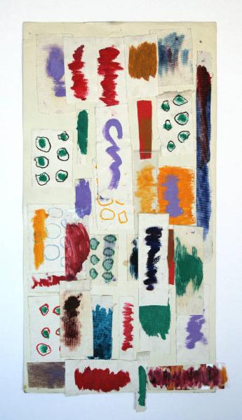 disegno a tecnica mista: pennarello, collage di pezzi di tela e plastica dipinti a olio, su cartoncino il cui recto è bianco, il verso marrone. Colore: diversi. Soggetto: studio per tappeto. Parti sporgenti.