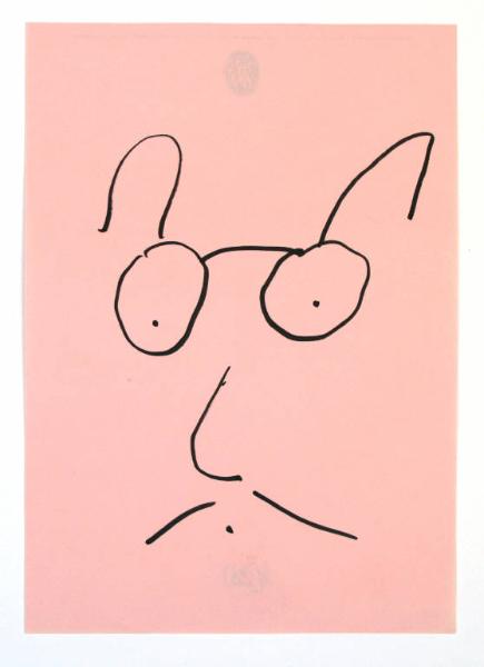 disegno a pennarello nero su carta rosa. Colore: rosa e nero. Soggetto: viso.