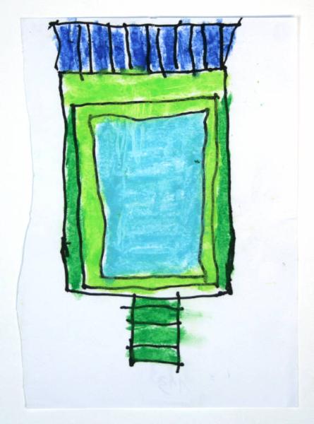 disegno a tecnica mista: pastelli a cera colorati e pennarello nero su carta bianca. Colore: celeste, azzurro, verde chiaro e scuro. Soggetto: studio decorativo. Foglio tagliato con andamento curvilineo, sul lato sinistro.