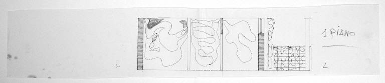 disegno a penna biro nera e matita su fotocopia. Colore: bianco, nero e grigio. Soggetto: progetto di decorazione parietale, i piano, sezione l.