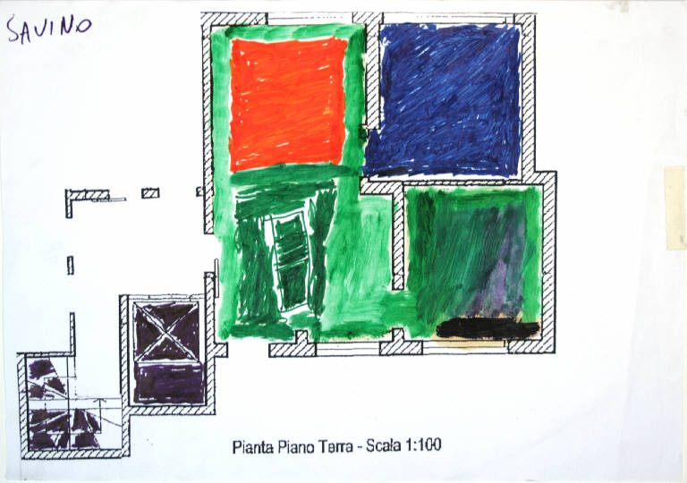 disegno a tecnica mista:pennarelli e olio su fotocopia. Colore: verde, arancio, blu e viola. Soggetto: progetto di pavimento, piano terra. Scritta in basso, al centro del foglio, in stampatello maiuscolo: "pianta piano terra - scala 1:100". Disegno firmato: Savino.