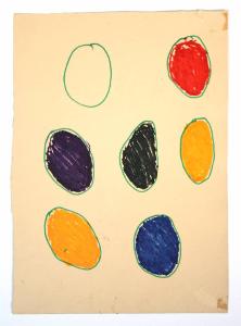 disegno a pennarelli e pastelli a olio su cartoncino beige. Colore: forme ovali verdi, contenenti altre forme di colore giallo, rosso, blu, nero, viola. Soggetto: bozzetto decorativo. Cartone tagliato sul lato.