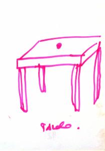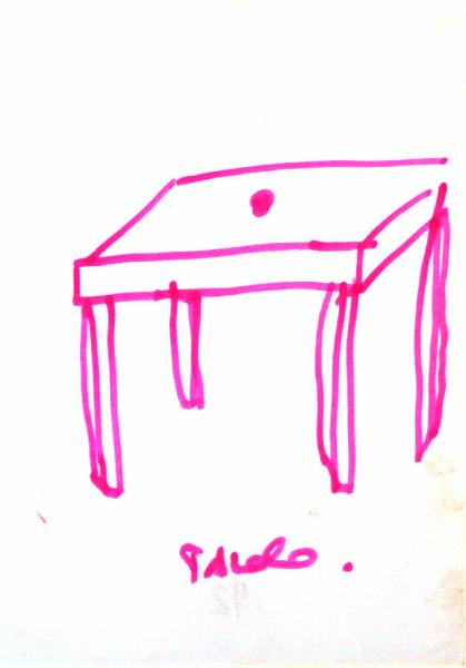 disegno con evidenziatore su carta. Colore: rosa fosforescente, bianco. Soggetto: progetto di oggetto di design - tavolo. Scritta in basso, al centro del foglio: "tavolo".