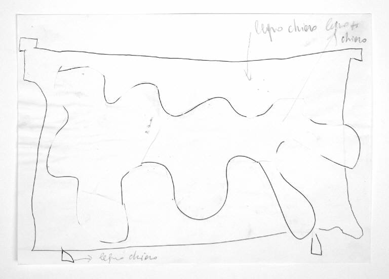 disegno a tecnica mista: penna biro e collage con carta bianca, disegnata con penna biro e ritagliata sulla linea di contorno del disegno. Colore: bianco e nero. Soggetto: progetto di design, tavolo. Diverse scritte: "legno chiaro" e "legno più chiaro", sui bordi del disegno.