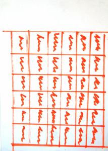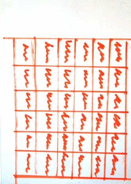 disegno a pennarello fosforescente su carta. Colore: arancione forforescente e bianco. Soggetto: bozzetto decorativo.