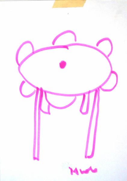 disegno a evidenziatore su carta. Colore: rosa e bianco. Soggetto: progetto di oggetto di design - tavolo. Scritta in basso: "tavolo".