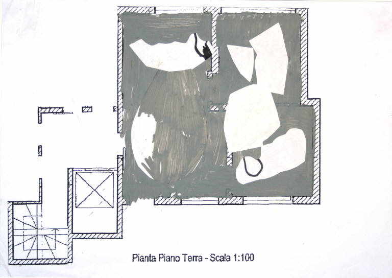 disegno a tecnica mista: collage, pennarello e pittura acrilica, su fotocopia. Colore: bianco, grigio e nero. Soggetto: progetto di pavimento. Scritta in basso al centro: "pianta piano terra - scala 1:100".