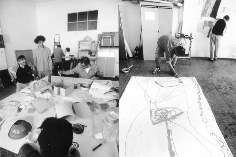 due immagini in una stampa offset in bianco e nero. Soggetto: attività laboratorio.