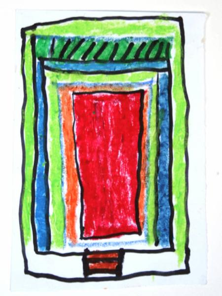 disegno a tecnica mista: pennarello e pastelli a olio su carta. Colore: bianco, nero, rosso, verde chiaro, arancio, blu. Soggetto: bozzetto decorativo.