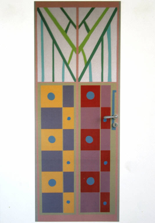 stampa offset a colori. Soggetto: porta della Comunità Parpagliona, progetto di Caterina Caserta.