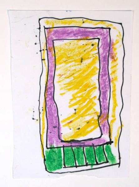 disegno a pennarello indelebile e pastello a olio su carta. Colore: bianco, nero, giallo, viola chiaro, verde. Soggetto: progetto per decorazione parietale.