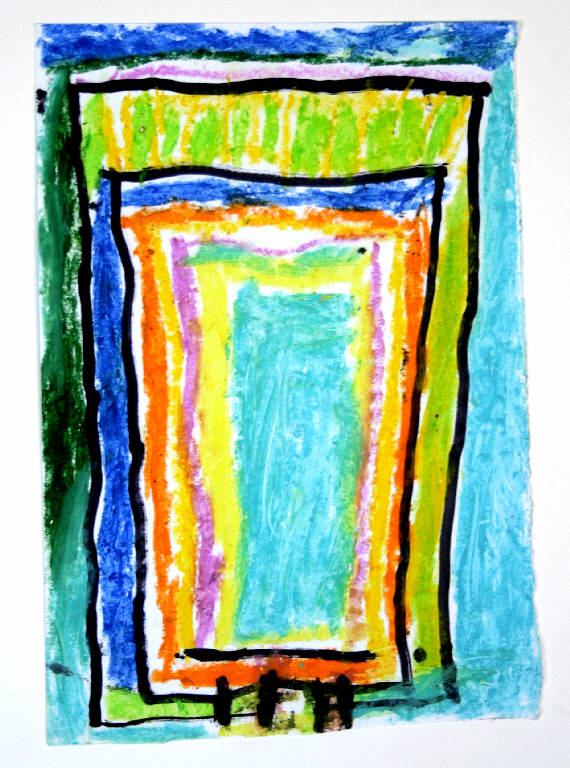 disegno a pennarello indelebile e pastello a olio su carta. Colore: bianco, nero, giallo, viola chiaro, verde chiaro e scuro, arancio, blu, azzurro. Soggetto: progetto per decorazione parietale.