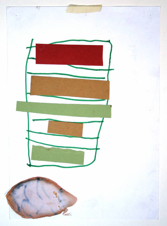 disegno a tecnica mista: pennarello, collage e turapori su carta. Colore: verde, rosso, beige. Soggetto: progetto di design - tavolo. Disegno firmato: Nico, e datato 16/04/02.