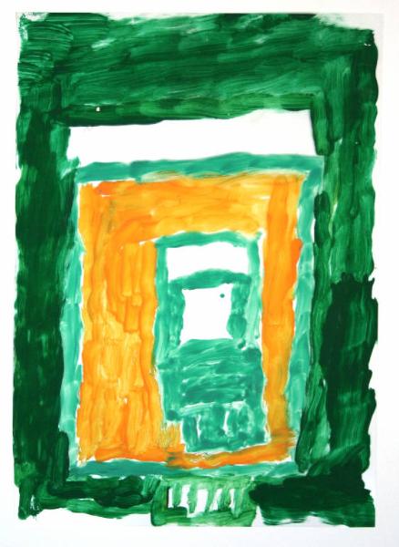 disegno ad acrilico su acetato. Colore: arancio, verde veronese e scuro. Soggetto: progetto per decorazione parietale.