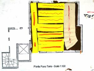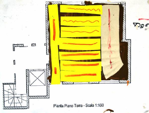 disegno a tecnica mista: collage con cartone e cartoncino decorati con pennarello, e acrilico su fotocopia. Colore: giallo fosforescente, rosso, marrone, bianco e nero. Soggetto: progetto per la decorazione del pavimento. Scritte: "pianta piano terra - scala 1:100".