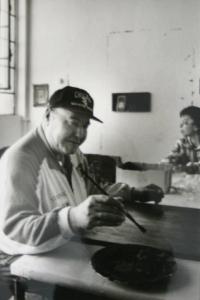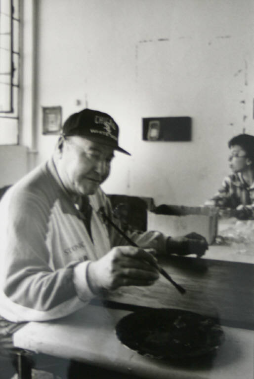 stampa fotografica in bianco e nero. Soggetto: ritratto di Savino Crudele al lavoro in laboratorio.