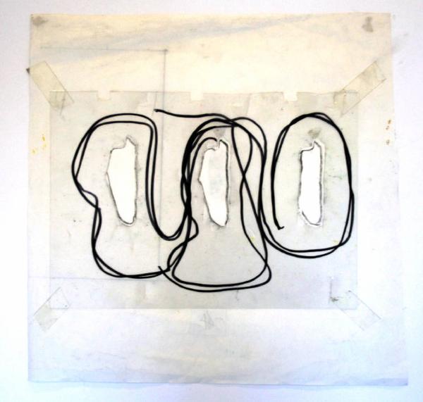 disegno a materiali vari: acetato, pennarello e scotch su carta. Colore: bianco e nero. Soggetto: progetto per decorazione parietale.