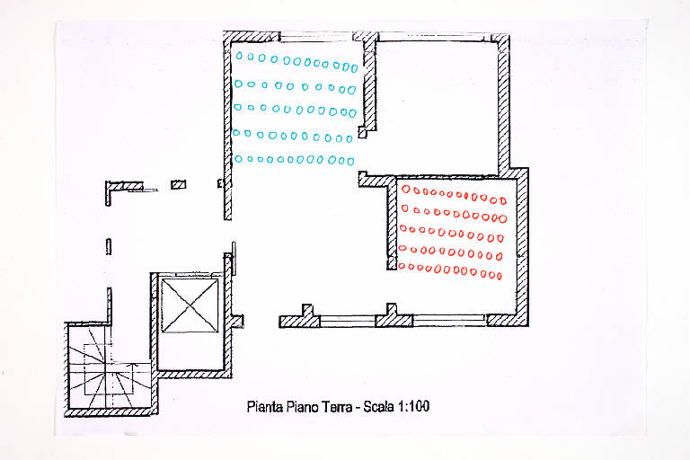 pennarello su fotocopia di carta bianca. Colore: nero, verde smeraldo, rosso. Soggetto: progetto di pavimento. Scritta: "pianta piano terra - scala 1:100".