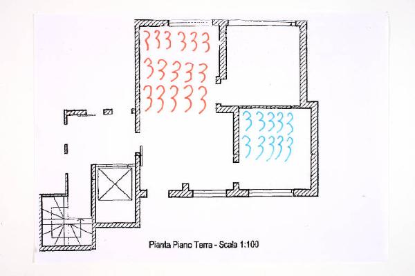 pennarello su fotocopia di carta bianca. Colore: nero, azzurro, rosso. Soggetto: progetto di pavimento. Scritta: "pianta piano terra - scala 1:100".