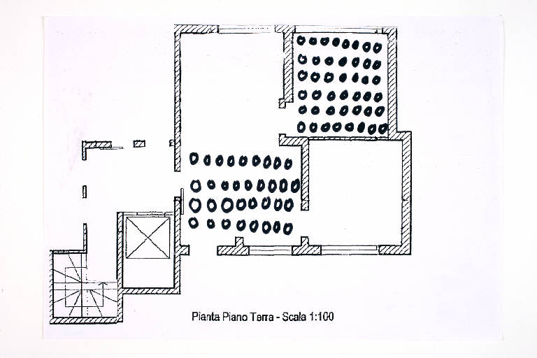 pennarello su fotocopia di carta bianca. Colore: nero. Soggetto: progetto di pavimento. Scritta: "pianta piano terra - scala 1:100".