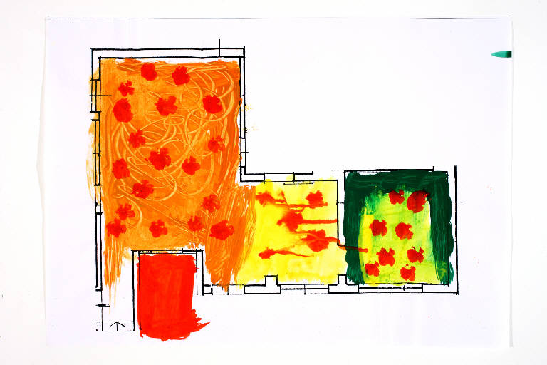 acrilico su fotocopia di carta bianca. Colore: nero, rosso, verde scuro, verde chiaro, giallo, ocra scura. Soggetto: progetto di pavimento. Disegno firmato e datato sul verso: "Savino, 18.02.02".