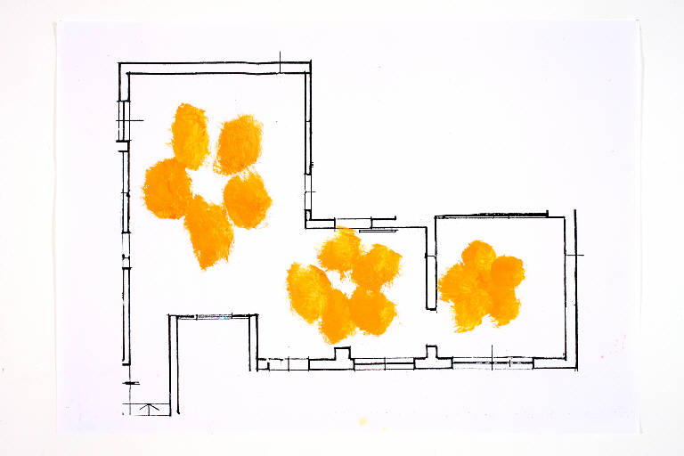acrilico su fotocopia di carta bianca. Colore: nero, arancio. Soggetto: progetto di pavimento.