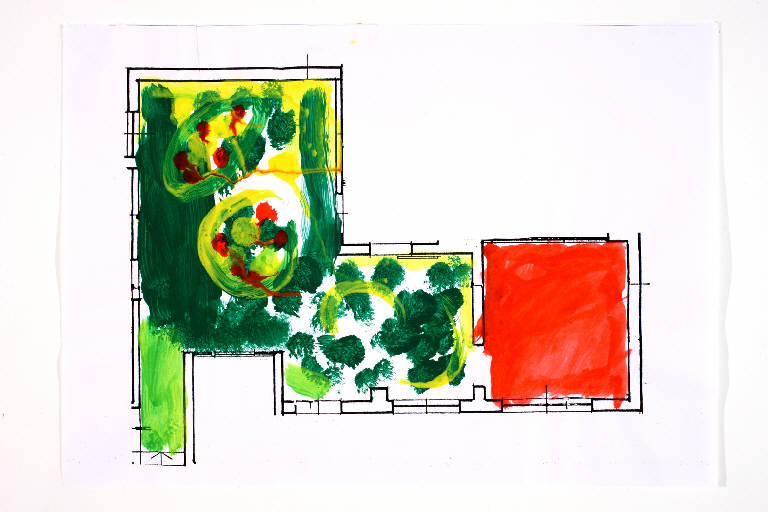 acrilico su fotocopia di carta bianca. Colore: nero, rosso, giallo, verde chiaro e verde scuro. Soggetto: progetto di pavimento. Disegno firmato e datato sul verso: "Savino, 18.02.02".