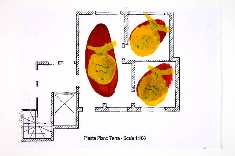 tecnica mista: acrilico e pennarello su fotocopia di carta bianca. Colore: nero, arancio, verde smeraldo, rosso scuro. Soggetto: progetto di pavimento. Scritta: "pianta piano terra - scala 1:100".