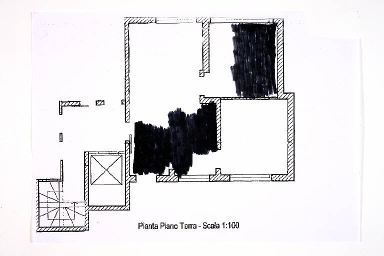 pennarello su fotocopia di carta bianca. Colore: nero, grigio scuro. Soggetto: progetto di pavimento. Scritta: "pianta piano terra - scala 1:100".