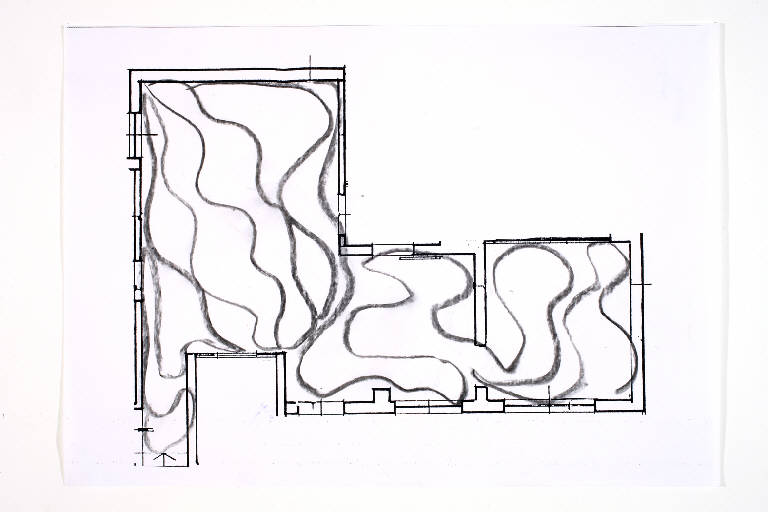 fusaggine su fotocopia di carta bianca. Colore: nero, grigio scuro. Soggetto: progetto di pavimento. Disegno firmato e datato sul verso: "Angela 18/02/02".