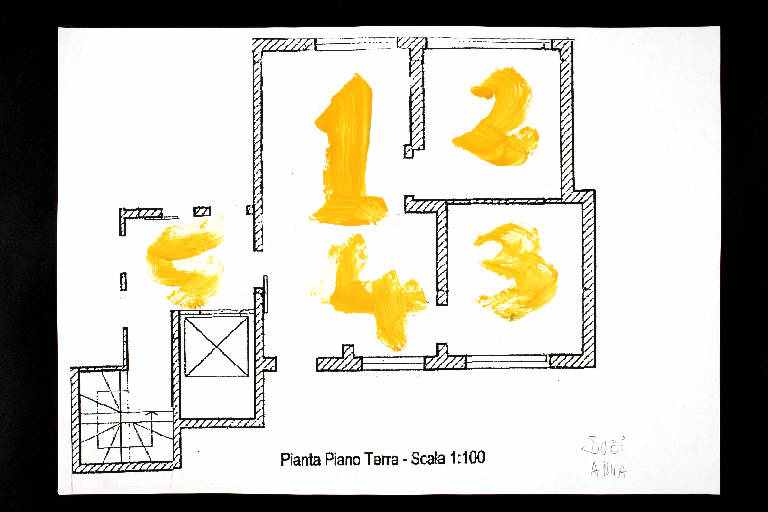 acrilico su fotocopia di carta bianca. Colore: nero, arancio chiaro. Soggetto: progetto di pavimento. Scritta: "pianta piano terra - scala 1:100". Disegno firmato sul recto a matita: "Susi", "Anna".