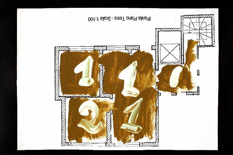 acrilico su fotocopia di carta bianca. Colore: nero, bianco, ocra gialla. Soggetto: progetto di pavimento. Scritta: "pianta piano terra - scala 1:100".