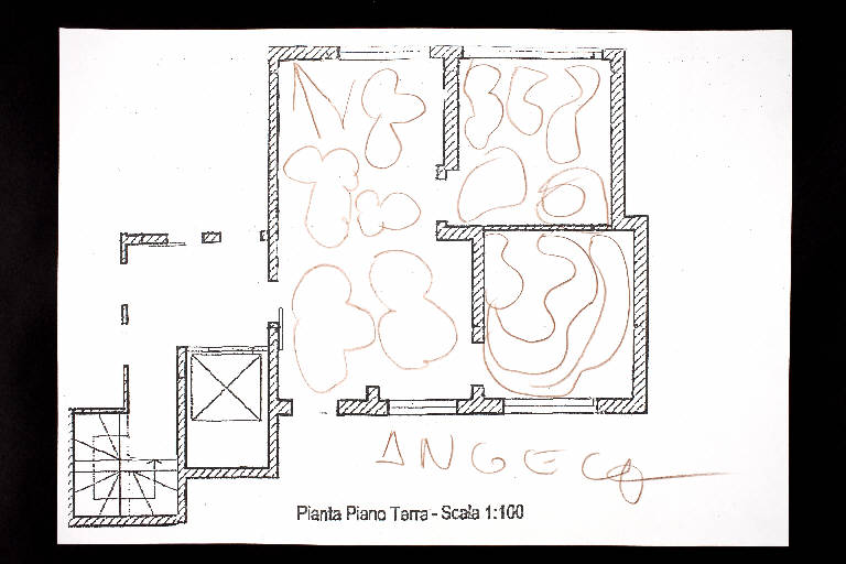 matita sanguigna scura su fotocopia di carta bianca. Colore: nero, marrone. Soggetto: progetto di pavimento. Scritta: "pianta piano terra - scala 1:100". Disegno firmato sul recto con matita sanguigna scura: "Angela".