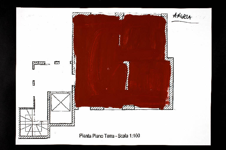 acrilico su fotocopia di carta bianca. Colore: nero, terra di Siena bruciata scura. Soggetto: progetto di pavimento. Scritta: "pianta piano terra - scala 1:100". Disegno firmato sul recto con pennarello nero: "Angela".