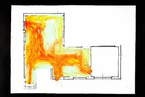 acrilico su fotocopia di carta bianca. Colore: nero, verde bianco, arancio, giallo, rosso. Soggetto: progetto di pavimento.