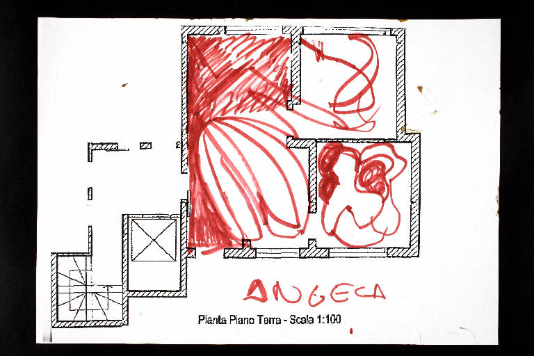 tecnica mista: pennarello e acrilico su fotocopia di carta bianca. Colore: nero, bordeaux, ocra scura. Soggetto: progetto di pavimento. Scritta: "pianta piano terra - scala 1:100". Disegno firmato sul recto con pennarello bordeaux: "Angela".