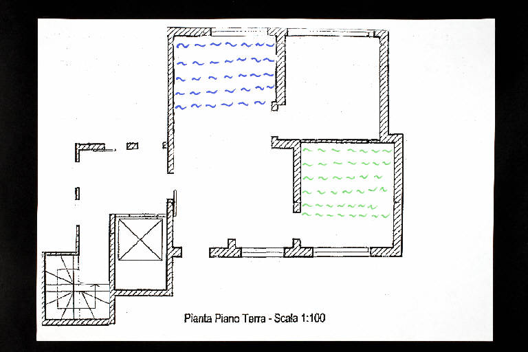 pennarello su fotocopia di carta bianca. Colore: nero, blu, verde chiaro. Soggetto: progetto di pavimento. Scritta: "pianta piano terra - scala 1:100".