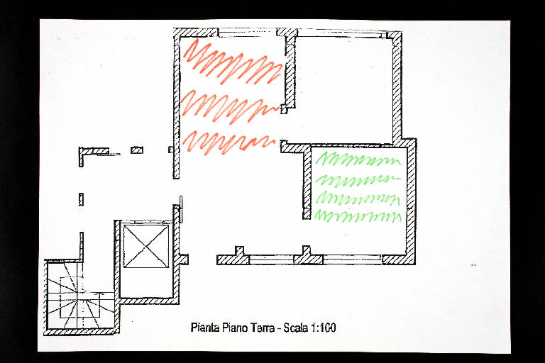pennarello su fotocopia di carta bianca. Colore: nero, verde chiaro, rosso. Soggetto: progetto di pavimento. Scritta: "pianta piano terra - scala 1:100".