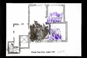tecnica mista: pennarello e fusaggine su fotocopia di carta bianca. Colore: nero, viola. Soggetto: progetto di pavimento. Scritta: "pianta piano terra - scala 1:100". Disegno firmato sul recto con pennarello viola: "Nicol".