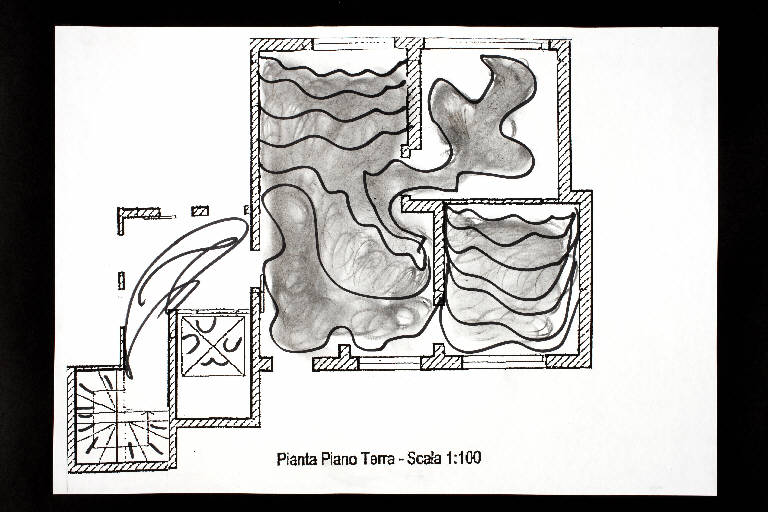 tecnica mista: fusaggine e pennarello su fotocopia di carta bianca. Colore: nero, grigio. Soggetto: progetto di pavimento. Scritta: "pianta piano terra - scala 1:100". Disegno firmato e datato sul verso: "Angela, 26/03/02".