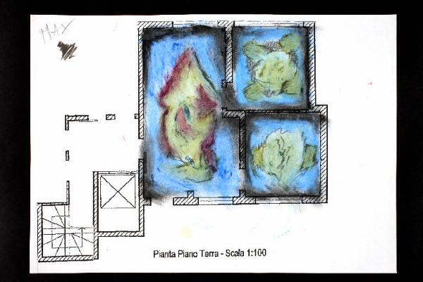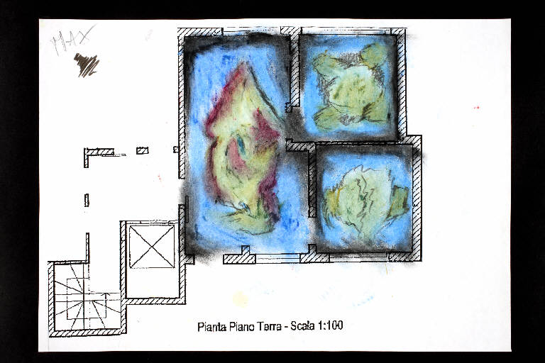 tecnica mista: fusaggine, matita, e pastello a cera su fotocopia di carta bianca. Colore: nero, grigio scuro, azzurro, verde vescica chiaro, viola, ocra chiara. Soggetto: progetto di pavimento. Scritta: "pianta piano terra - scala 1:100". Disegno firmato sul recto a matita: "Max".