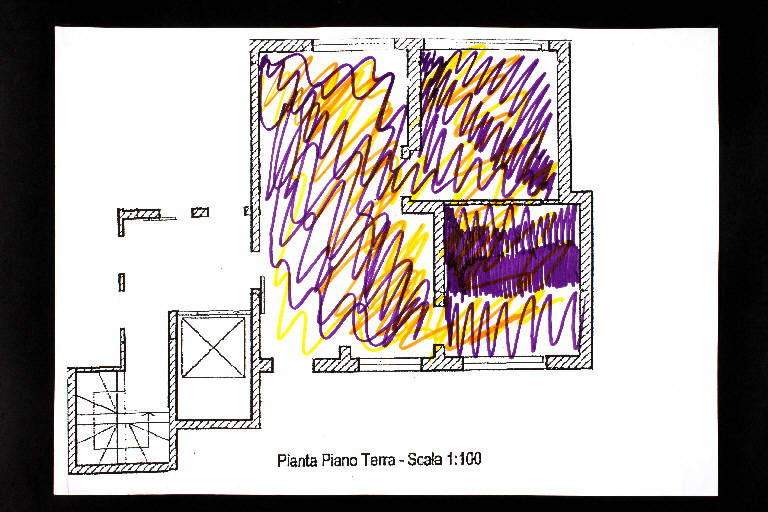 pennarello su fotocopia di carta bianca. Colore: nero, viola, giallo, arancio. Soggetto: progetto di pavimento. Scritta: "pianta piano terra - scala 1:100". Disegno firmato e datato sul verso: "Angela".